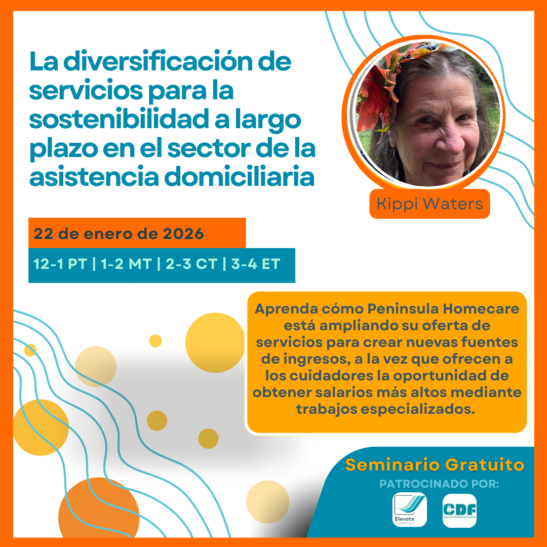 ¡Únase a nosotros este mes para un seminario web sobre La diversificación de servicios para la sostenibilidad a largo plazo en el sector de la asistencia domiciliaria! Aprenda de Kippi Waters, directora fundadora de Peninsula Homecare, sobre cómo están ampliando su oferta de servicios para crear nuevas fuentes de ingresos, a la vez que ofrecen a los cuidadores la oportunidad de obtener salarios más altos mediante trabajos especializados.